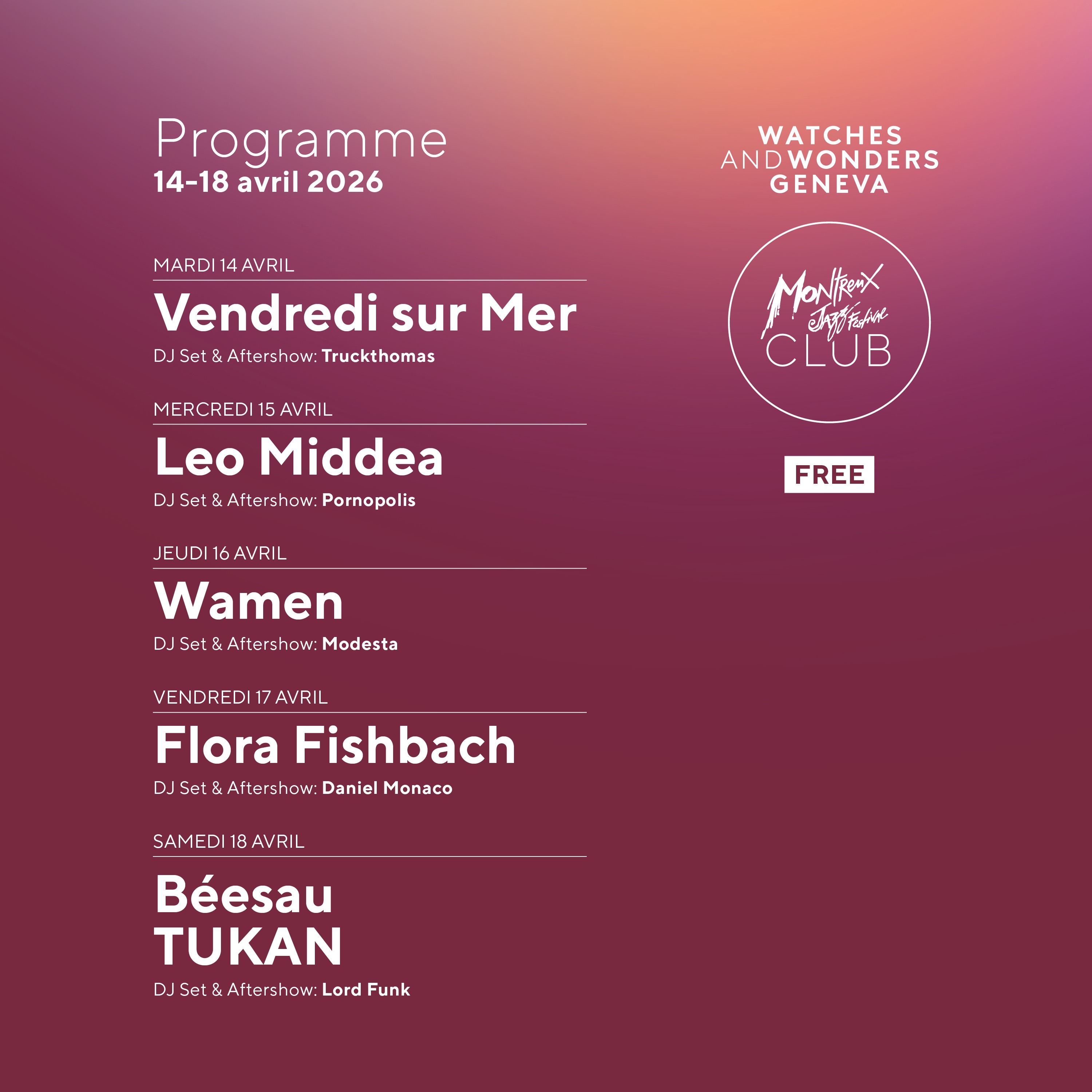 Du 14 au 18 avril, l’esprit du Montreux Jazz Festival s’empare de Genève, dans le cadre du programme « In The City » du salon horloger Watches & Wonders. Durant cinq soirées consécutives, un Montreux Jazz Club éphémère ouvrira ses portes au Quai du Général-Guisan pour offrir une expérience musicale immersive et intimiste.